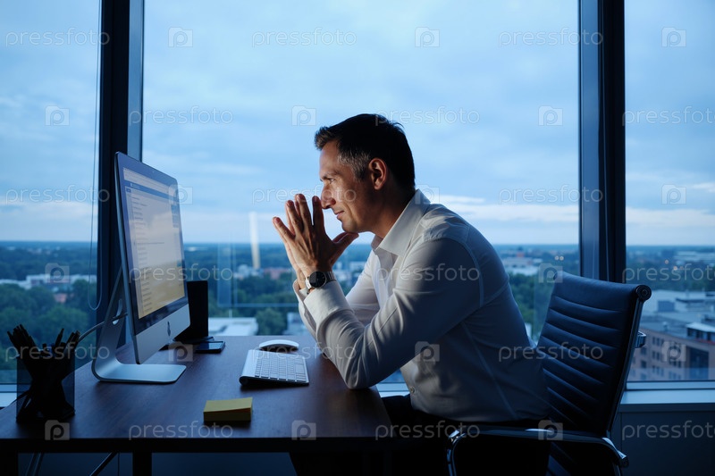 Мужчина средних лет концентрируется, работая на компьютере в офисе