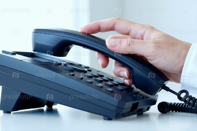 Женская рука отвечает на стационарный телефон в современной офисной обстановке