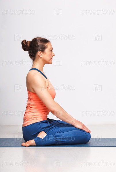 Женщина в атха-йоге асана vajrasana - ваджра поза или бриллиантовая поза на йога-матке на йога-мате в студии на сером поле для мешков