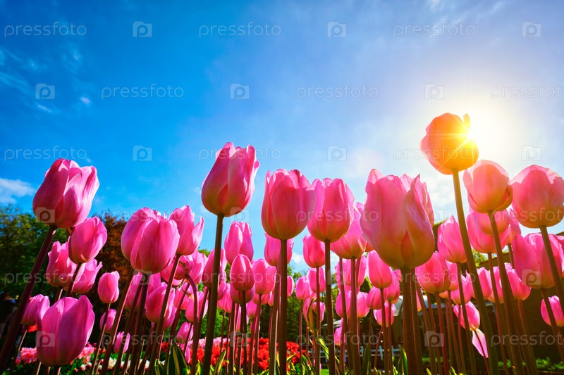 Цветущие тюльпаны напротив голубого неба с низкой смотровой точки