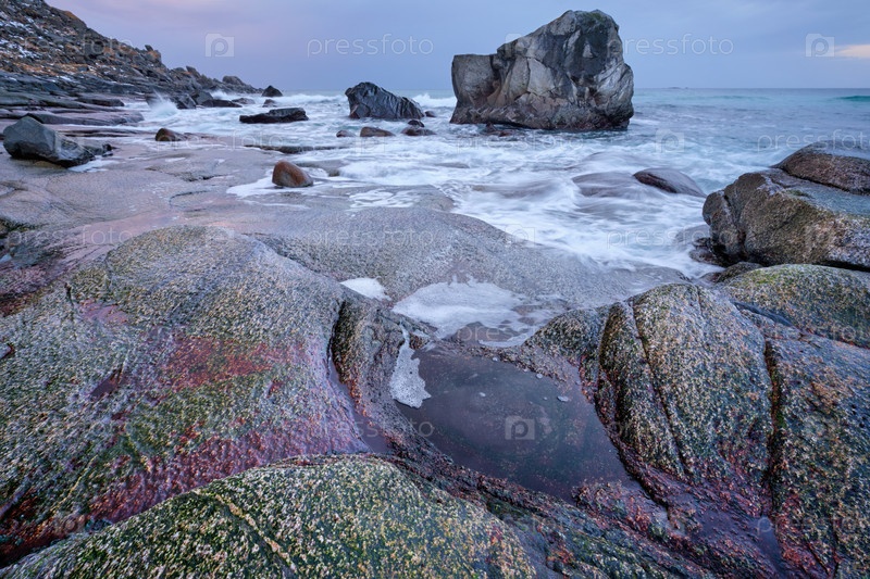 Скалы на пляже фьорда Норвежского моря во время зимнего заката.Пляж Утаклиев, Лофотенские острова, Норвегия