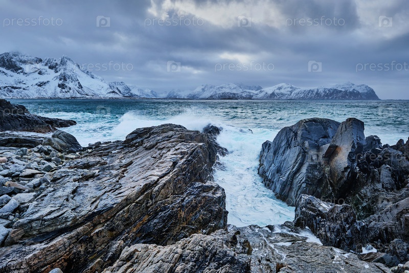 Волны Норвежского моря раздавливаются на скалистом побережье в фьорде