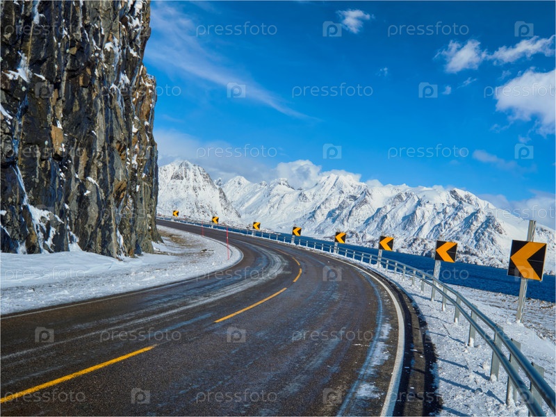 Дорога находится в норвежском фьорде.Острова Лофотен, Норвегия