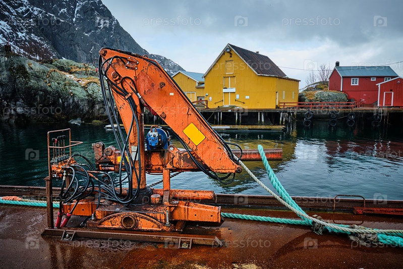 Кран на пирсе в Нусфьорде аутентичная рыбацкая деревня зимой с домами красного руербу