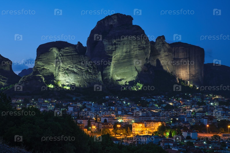 Деревня Каламбака в знаменитом греческом туристическом направлении Метеора в Греции ночью