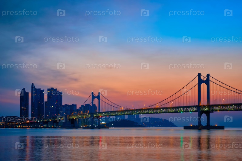 Мост Гванган на рассвете с небоскребами и драматическим небом.Бусан, Южная Корея