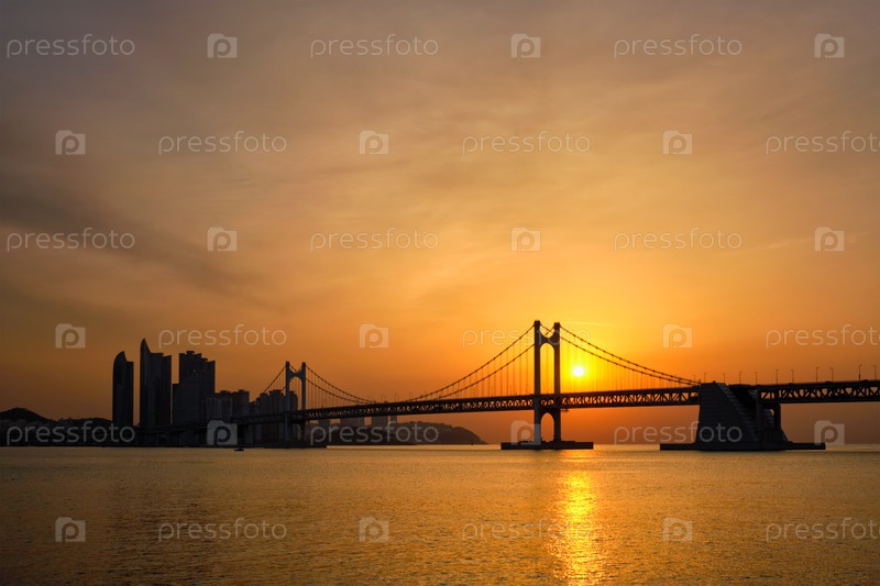 Мост Гванган на рассвете с небоскребами и драматическим небом.Бусан, Южная Корея