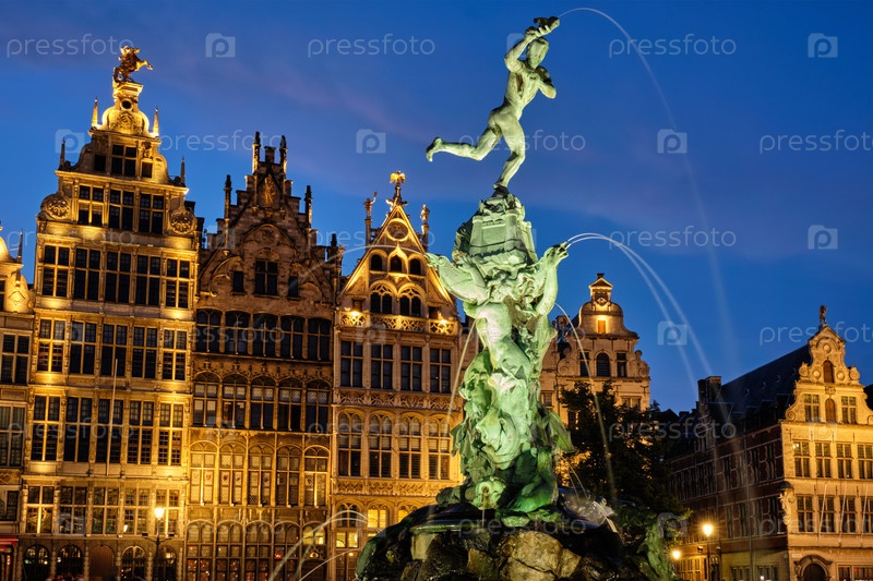 Знаменитая статуя Брабо в Антверпене и фонтан на площади Grote Markt Square освещены ночью и старыми домами
