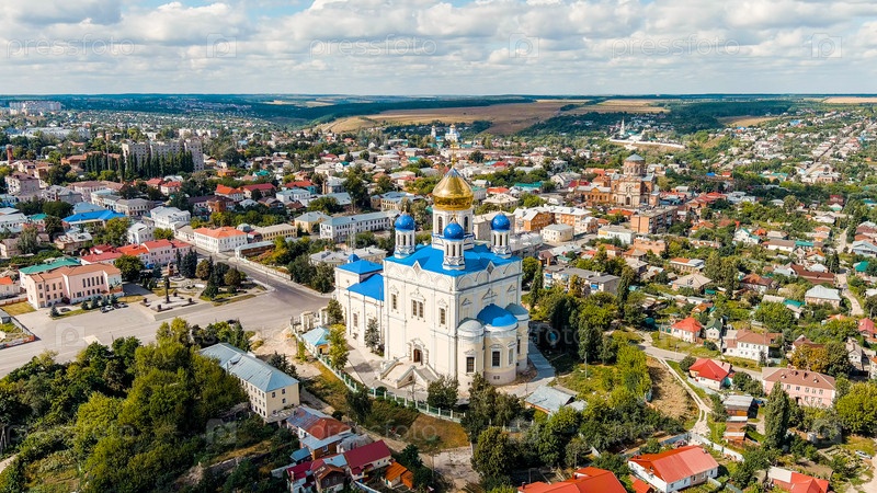 Елец, Липецкая область, Россия. Собор Вознесения Господня. Река сосна. Исторический центр города, вид с воздуха