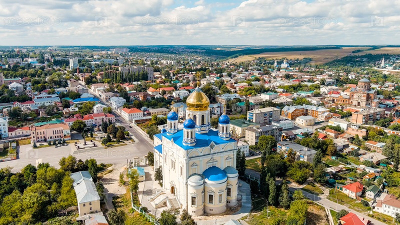 Елец, Липецкая область, Россия. Собор Вознесения Господня. Река сосна. Исторический центр города, вид с воздуха