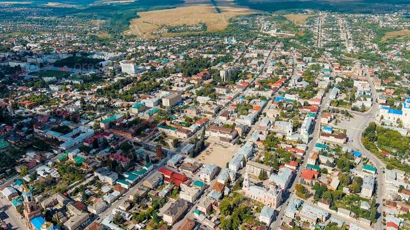 Елец, Липецкая область, Россия. Собор Вознесения Господня. Река сосна. Исторический центр города, вид с воздуха