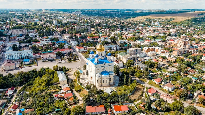 Елец, Липецкая область, Россия. Собор Вознесения Господня. Река сосна. Исторический центр города, вид с воздуха
