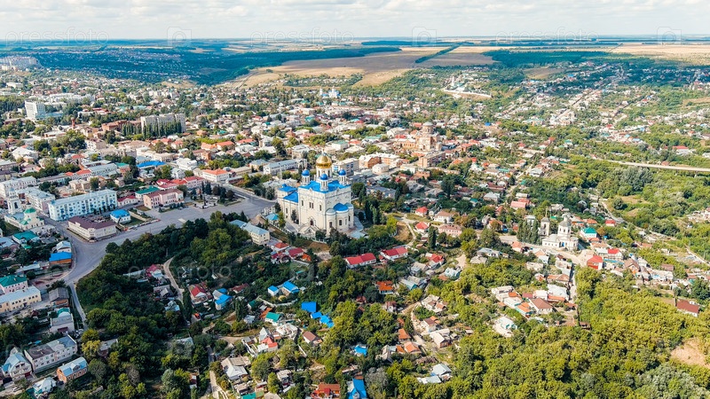 Елец, Липецкая область, Россия. Собор Вознесения Господня. Река сосна. Исторический центр города, вид с воздуха