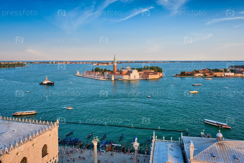 Вид с воздуха на Венецианскую лагуну с лодками и церковью Сан-Джорджио ди Маджоре