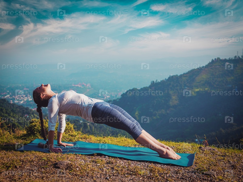 Женщина, практикующая хата-йогу асана Purvottanasana позирует на открытом воздухе в горах. винтажный ретро эффект отфильтрован изображение хипстерского стиля