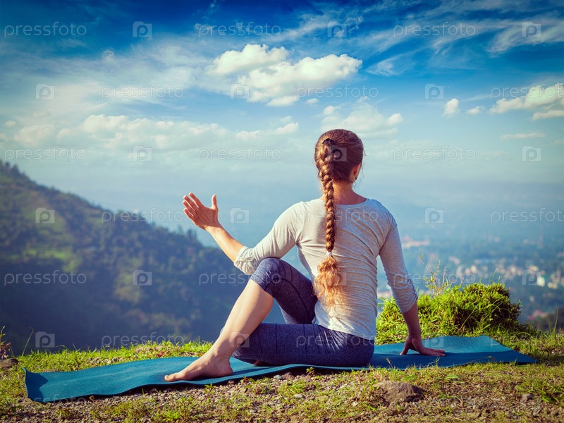 Внешняя хатха-йога - это женщина, практикующая асану йоги Parivrtta Marichyasana ardha matsyendrasana - сидящий спинной поворот на открытом воздухе в горах утром