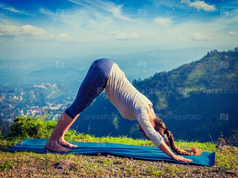 Йога на открытом воздухе - женщина выполняет астангу Аштанга Виньяса йоги, асану Адхо лететь свансана вниз лицом к собаке у Сурья Намаскара Солнечный приветствие на улице в Гималаях по утрам. винтажный ретро-эффект хипстерского образа