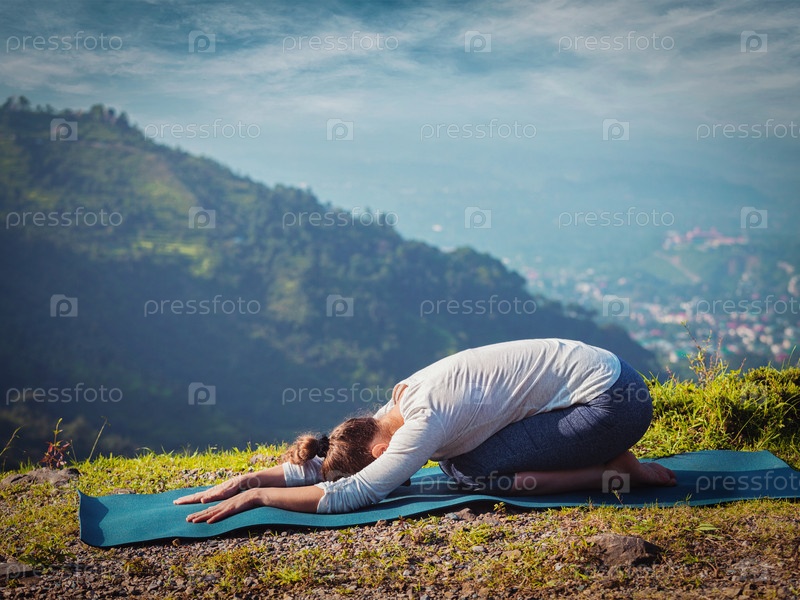 Женщина в спортивной форме практикует асану йоги Balasana - ребенка, позирующего на открытом воздухе в горах.Винтажный ретро-эффект отфильтровал изображение хипстера