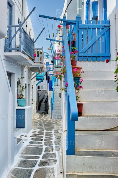 Живописные живописные узкие греческие улицы с традиционными белыми домами с голубыми окнами дверей города Миконос в знаменитой туристической достопримечательности острова Миконос, Греция