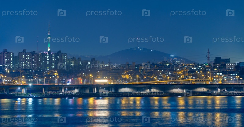 Ночной вид Сеула с башней Намсан над рекой Хан.Сеул, Южная Корея