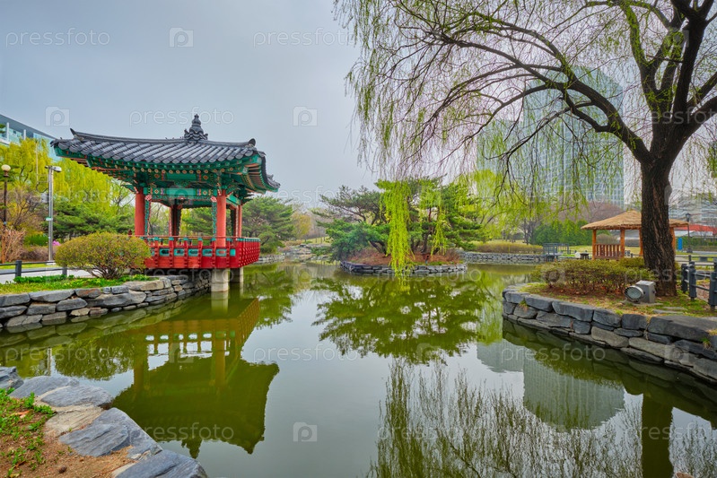 Yeouido Park общественный парк пруд с загородным павильоном в Сеуле, Корея