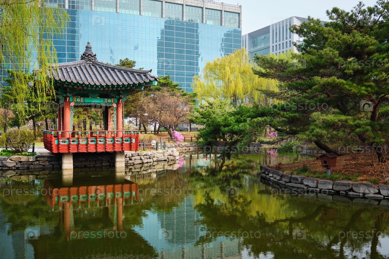 Yeouido Park общественный парк пруд с загородным павильоном в Сеуле, Корея