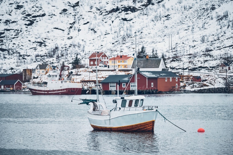 Рыболовная лодка в рыбацкой деревне Хамной на Лофотенских островах, Норвегия с домами из красного руербу