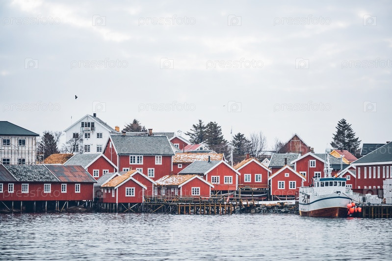 Рейнская рыбацкая деревня на Лофотенских островах с красными домами руербу зимой со снегом и рыболовными лодками