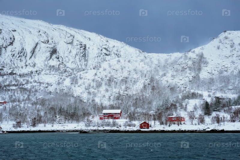 Традиционные дома красного руербу на берегах фьорда зимой в снегу.Острова Лофотен, Норвегия