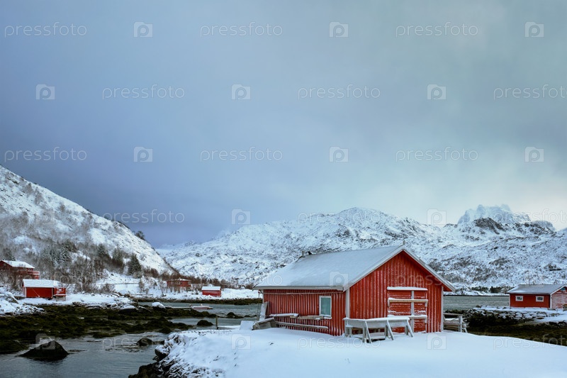 Рорбу Красный дом зимой, Лофотенские острова, Норвегия