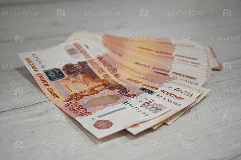 Русские бумажные деньги номиналом в пять тысяч рублей лежат на столе