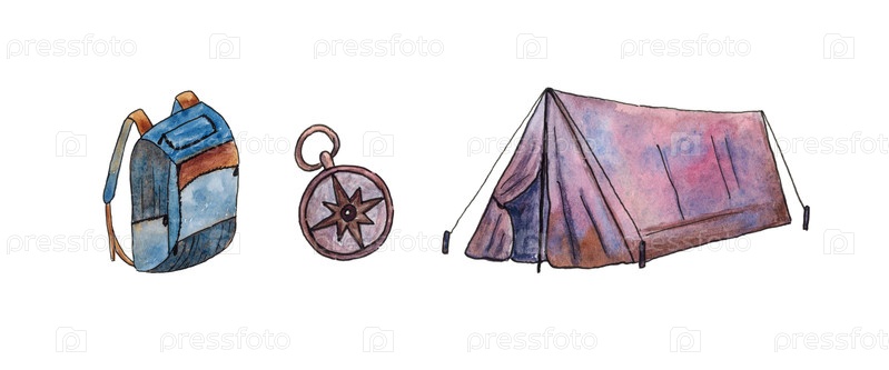 Комплект для кемпинга. палатка, рюкзак и компас. акварельные клиппарты на белом фоне. ручной рисунок