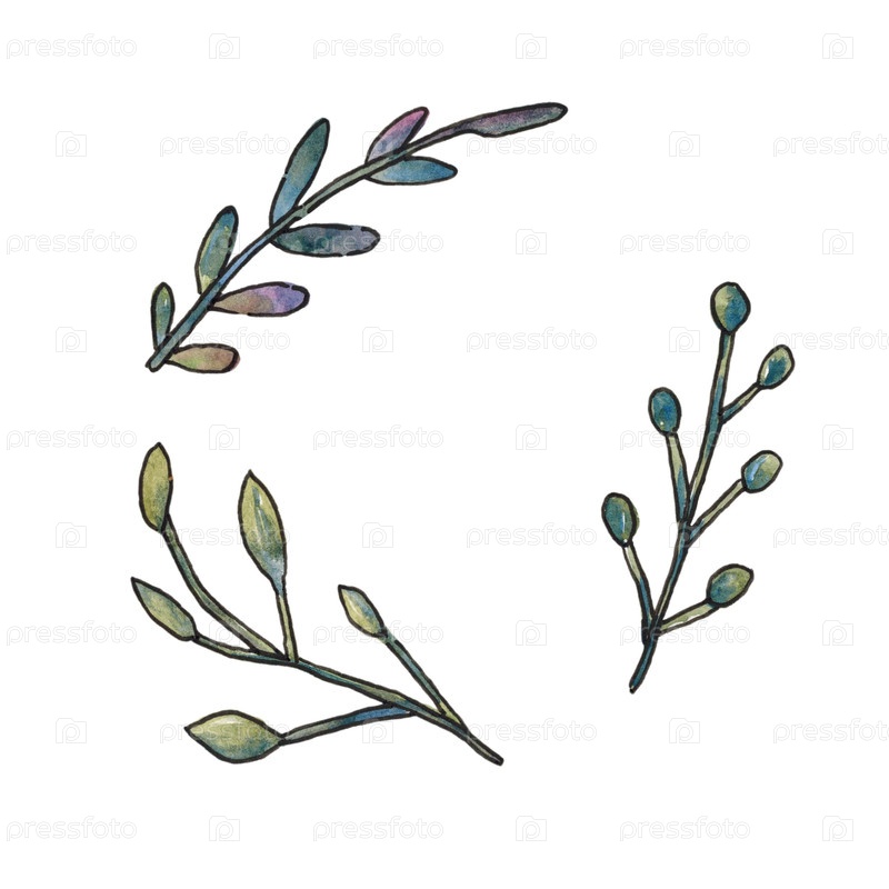 Набор ветвей, изолированных на белом фоне. он может использоваться в качестве рамы с пространством для текста. тонкая стилизованная иллюстрация, ручной рисунок акварелью