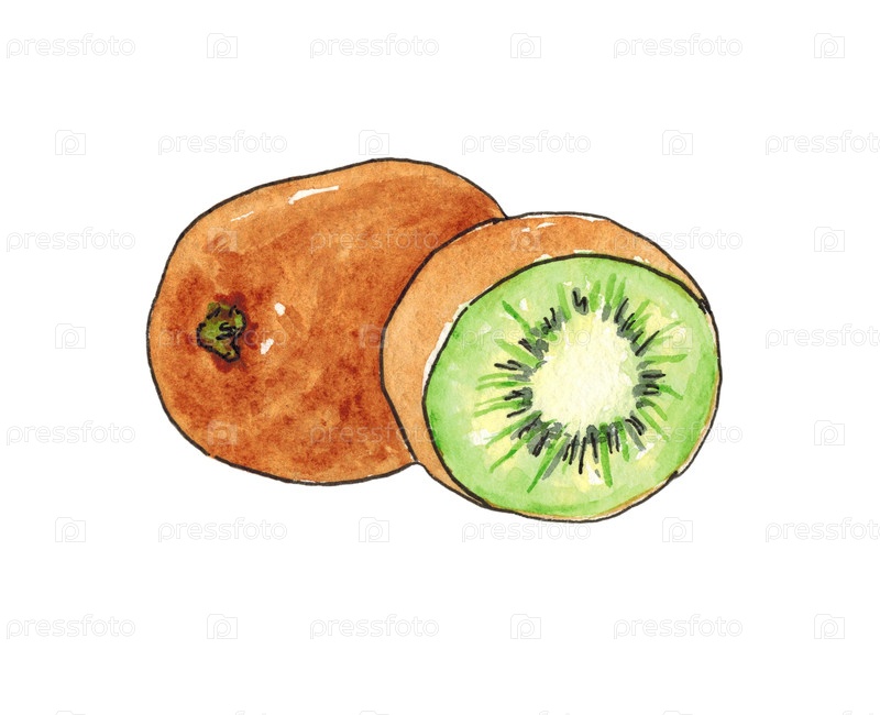 Киви полностью и наполовину изолированы на белом фоне. Контур - живая линия. Иллюстрация написана вручную акварелью