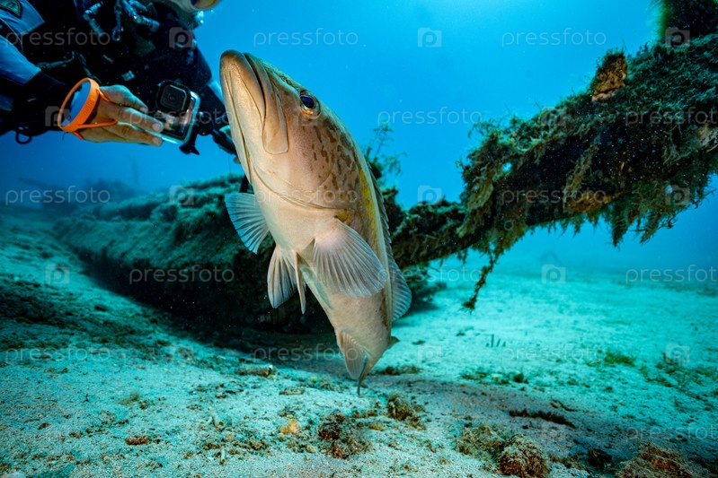 Группер (рыба из семейства каменных гребешек) и дайвер. Кас Турция. 2025