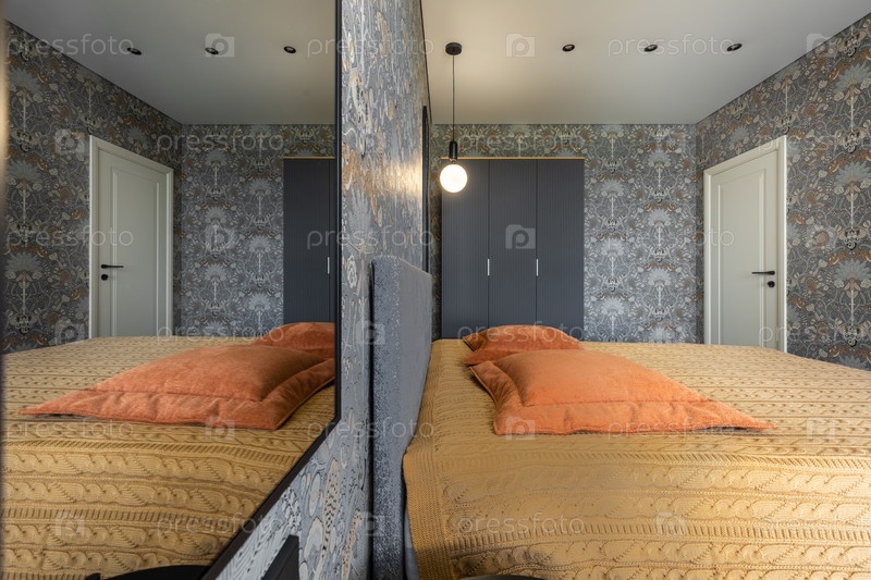 Современная спальня с декоративной обои, зеркальное отражение, уютная кровать с теплым одеялом и подушками, минималистическая мебель