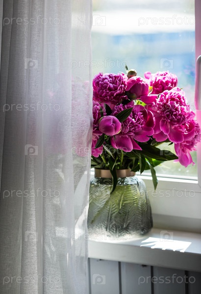 Букет ярко-розовых пионных цветов в стеклянной вазе на подоконнике.Цветы и почки в вазе.Ясный розовый, цветочный фон