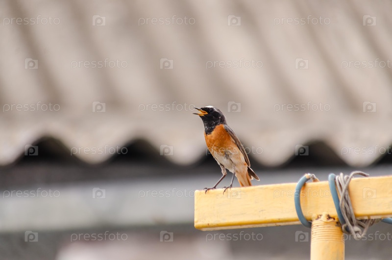 Близкий план чернохвостого (мужчины), сидящего на краю ярко-желтого металлического профиля