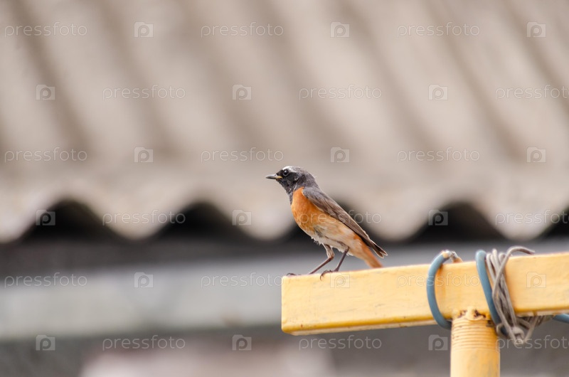 Близкий план чернохвостого (мужчины), сидящего на краю ярко-желтого металлического профиля