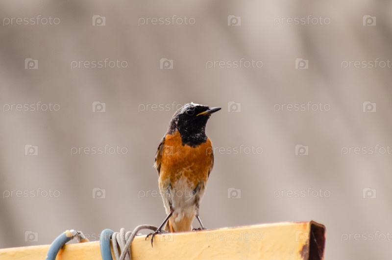 Близкий план чернохвостого (мужчины), сидящего на краю ярко-желтого металлического профиля