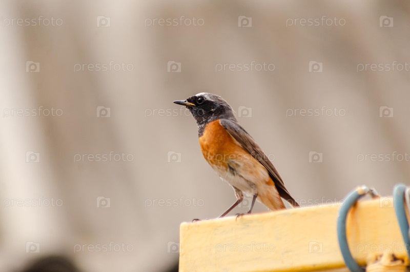 Близкий план чернохвостого (мужчины), сидящего на краю ярко-желтого металлического профиля
