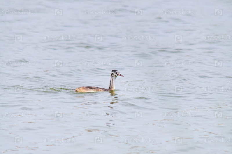 Младенец чомги (или поганки) плавает в реке