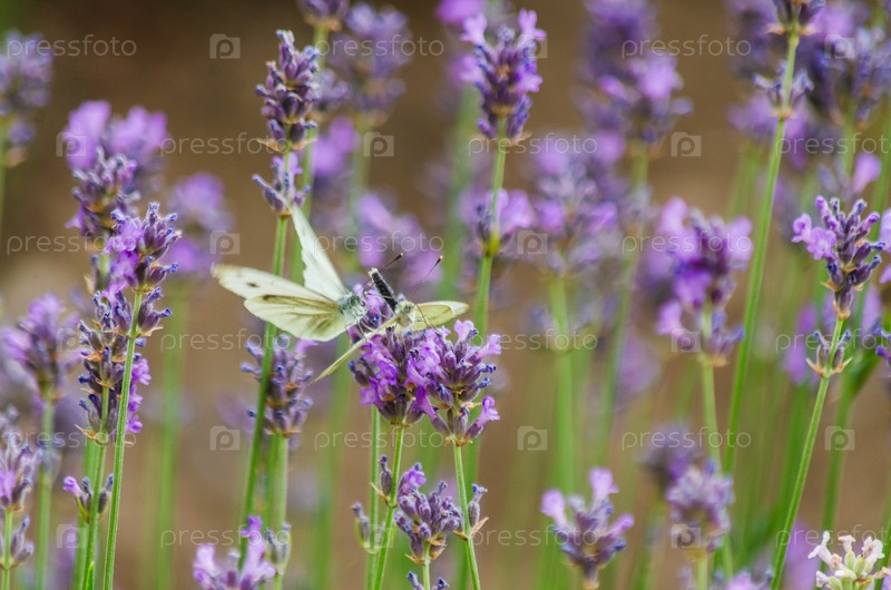 Близкий план деликатных бабочек белой капусты, пьющих нектар от ярко-фиолетового цветка лаванды