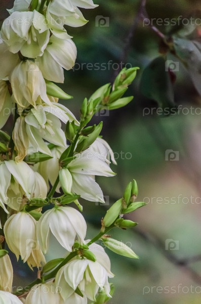 Близкий план нежных белых цветов юкки с зелеными бутонами на темном, размытом фоне