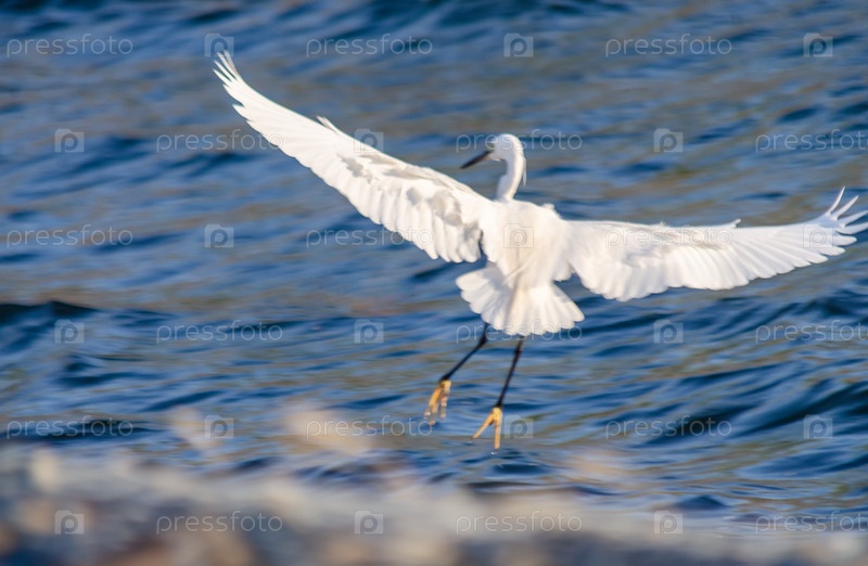 Белый гребешок летает низко над блестящей голубой поверхностью воды