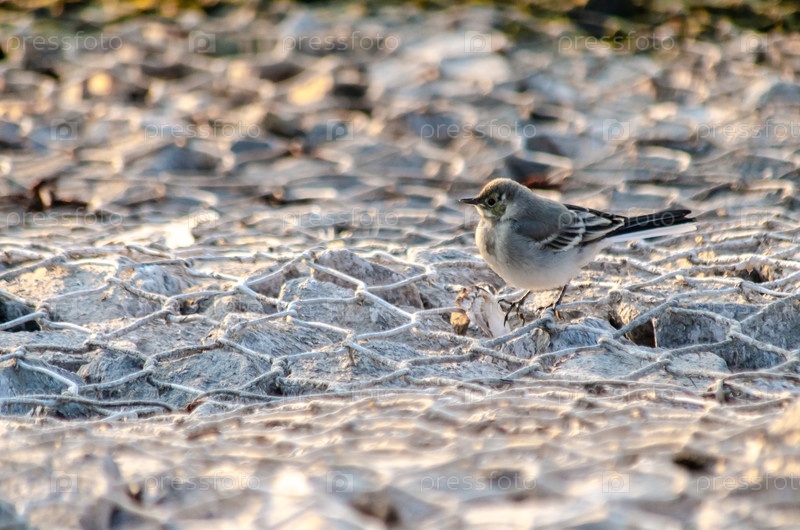 Молодой белый вагтейл на габионном кургане в мягком свете