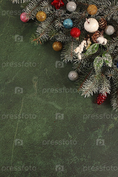 Красивый рождественский и новогодний фон с живыми ветвями снежных елей, украшениями и игрушками, дизайн продукта для праздничной рекламы, концепция канун Рождества, зимняя карта праздника и баннер