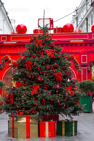 Фантастический рождественский фон. Подарочные коробки под деревом в Москве. Концепция покупки подарков. Новогодняя открытка 2026