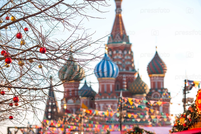 Отдых на улицах Москвы перед Василием Блаженным. красивый рождественский фон для 2026 года. декорация концепции нового года