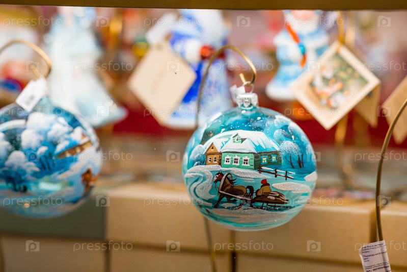 Витрины Центрального магазина GUM. Продажа игрушек для рождественской елки. Стеклянный шар с ручными украшениями. Россия, Москва, 9 января 2025